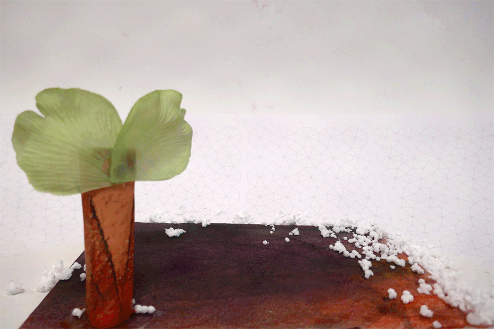 En dix séances de 2 heures environ, chaque élève a confectionné un paysage comme une sorte de mise en scène surréelle, à l’échelle miniature d’une table de travail.